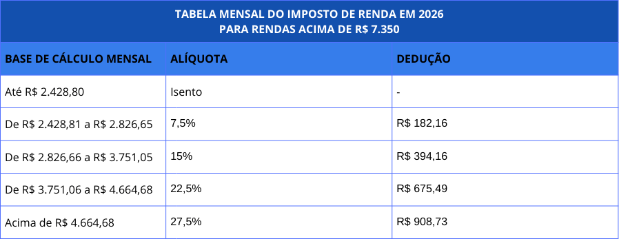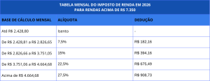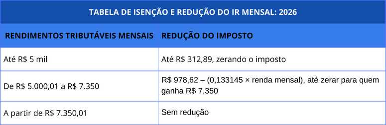 Para remunerações entre R$ 5.000,01 e R$ 7.350,00, foi criada uma redução gradual do imposto, aplicada por meio de redutores adicionais, sem alteração da tabela tradicional do IR.